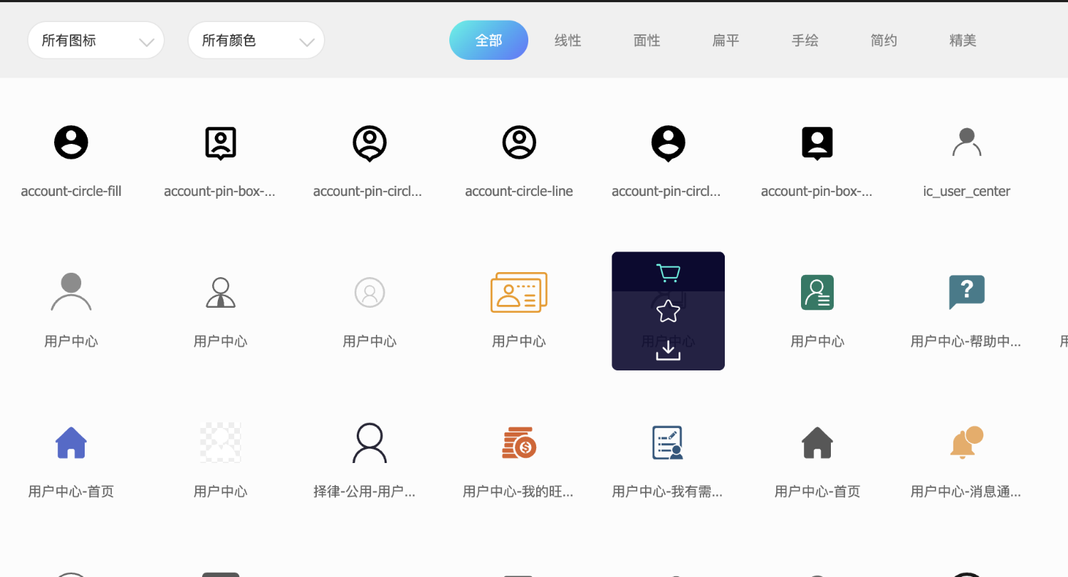 比如输入用户中心几个字,即可出来用户中心相关的图标: